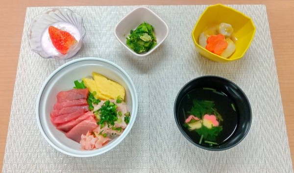 メニュー:2種のまぐろ丼、梅花麩のすまし汁、里芋の田楽、菜の花とアサリの辛し和え、いちごババロア